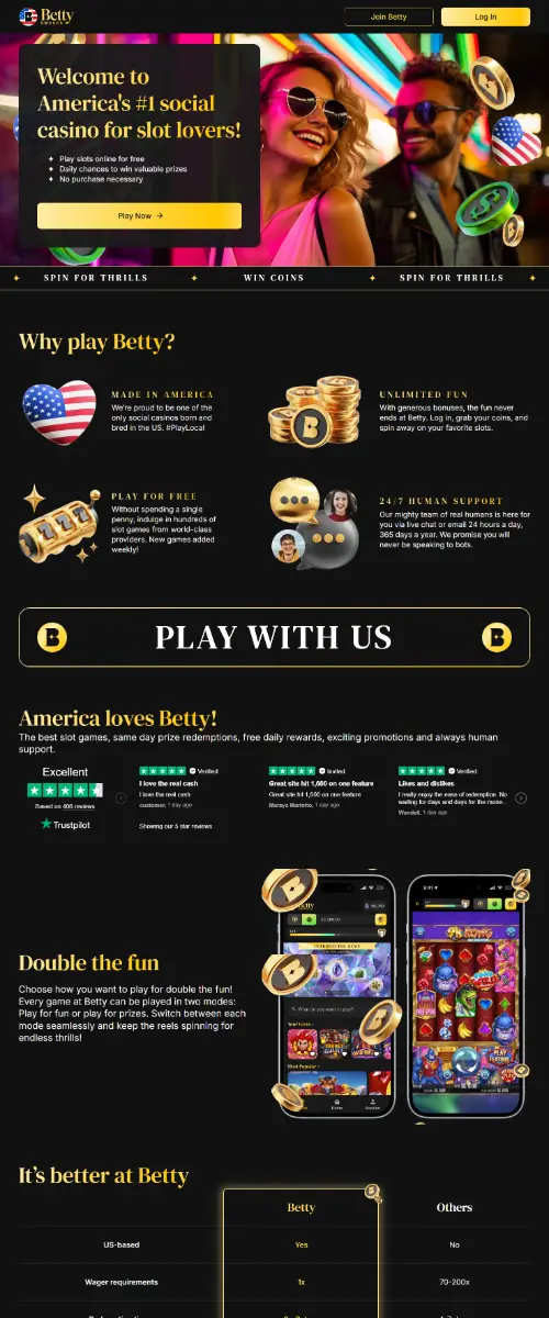 A daily wheel and the Gems system add light gamification. Gems are earned through level-ups and select purchases, then exchanged for Betty Coins, Sweeps Coins or free spins.