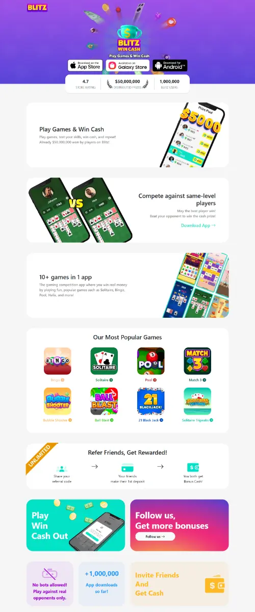 Blitz Win Cash focuses on rapid, phone-forward skill titles and straightforward cash handling via PayPal, Venmo and Apple Pay, along with a low $10 withdrawal. If you prefer quick head-to-heads on mobile, it delivers; however, no Sweeps Coins system, no sizable welcome bundle and no slots.