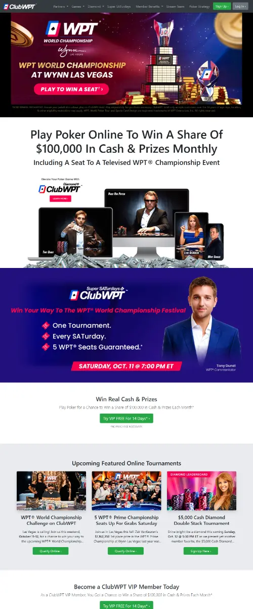 ClubWPT runs on Play Chips for casual play and Tournament Points for VIP and Diamond access. From our research, prize claims carry no wagering requirement, which feels simpler than the 1x playthrough many sweeps sites use. Reward points can expire if not used by a date set by ClubWPT and may be forfeited after 30 days of account inactivity. We could not verify specific game restrictions on prize eligibility in the casino section.