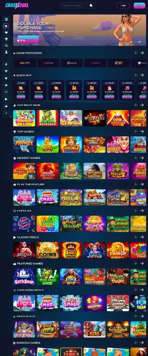 CrashDuel’s hook: a broad crash lineup and a surprisingly large library of 1,000+ games with live dealers, plus quick gift card redemptions. Note that early user feedback looks very negative.