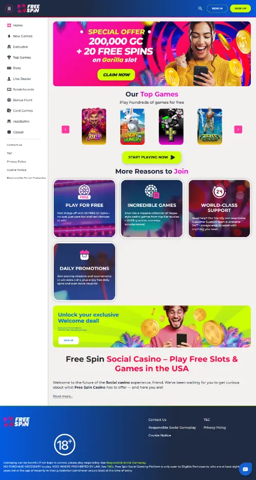 Free Spin opens with solid value, headlined by 20 free spins worth about 20 Sweeps Coins at signup and a 650+ title catalog that even features live dealer tables. Redemption routes include bank transfers, crypto in some regions, and gift cards, a wider mix than many rivals.