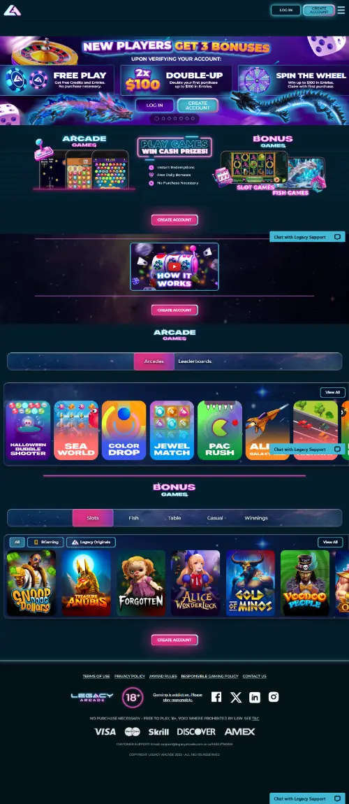 Legacy Arcade earns praise for swift redemptions that often hit the same day and a generous daily 100 Entries freebie after verification. The arcade‑style mix features fish shooters and Plinko with BGaming slots, though the catalog runs smaller than many rivals.