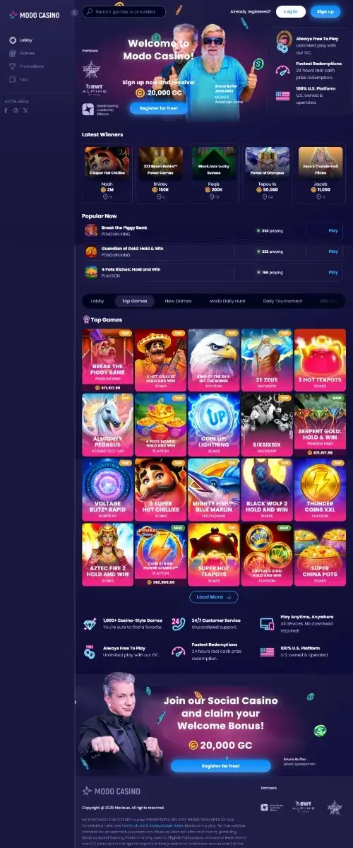 Fast, fee-free redemptions that typically process in about 24 hours, plus a catalog of 1,100 plus games with live dealers, make Modo US an easy pick. Daily SC from login streaks and Apple Pay for purchases bring convenience.