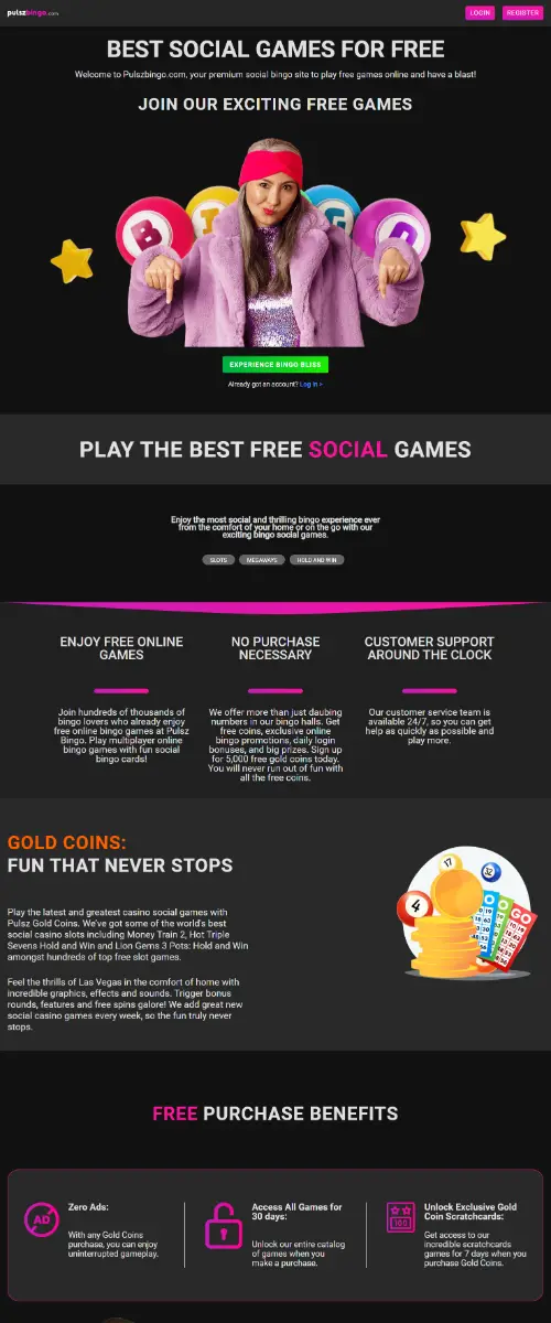 Pulsz Bingo sells GC only; SC come from signups, promos, logins, referrals, and events. Larger GC bundles often improve GC per dollar, helping casual play, although no SC come with these packages.