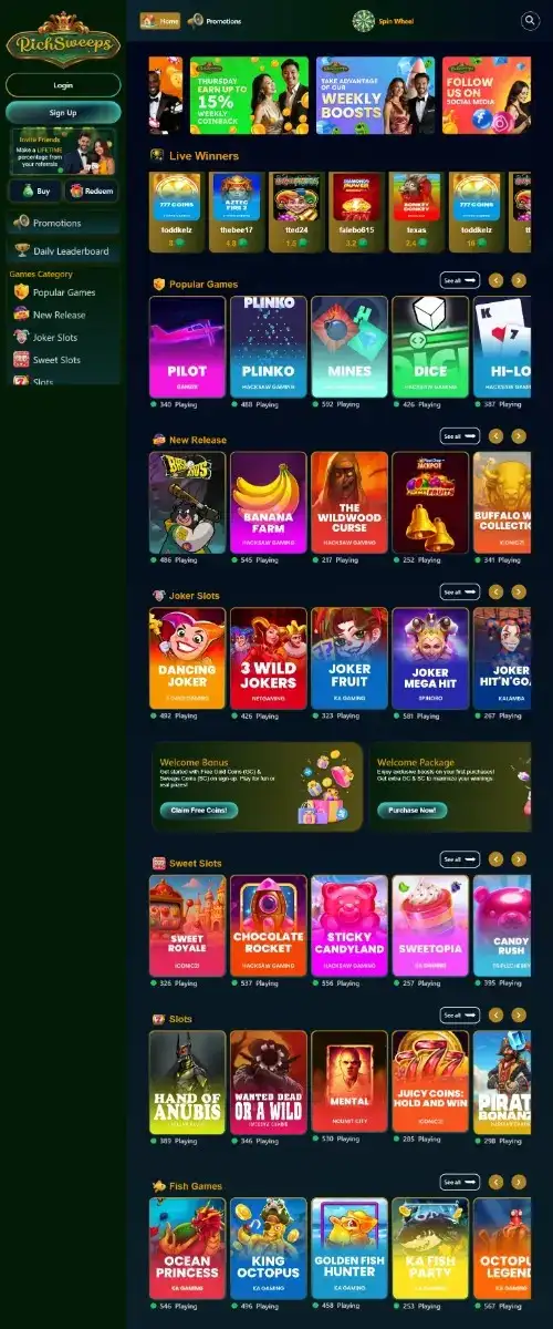 RichSweeps offers a huge game library, flexible banking with PayPal, Venmo and crypto, and a first purchase deal that delivers high SC value. Daily wheel rewards up to 20 SC add a nice bonus.