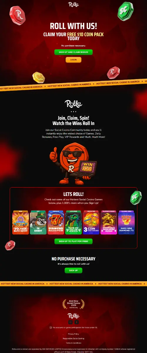 Rolla opens with a generous no‑purchase welcome of 10 SC plus 500k GC and a deep slot lineup of 2,000+ titles. On paper it checks many boxes, but current player feedback on verification and support keeps it from the top tier.