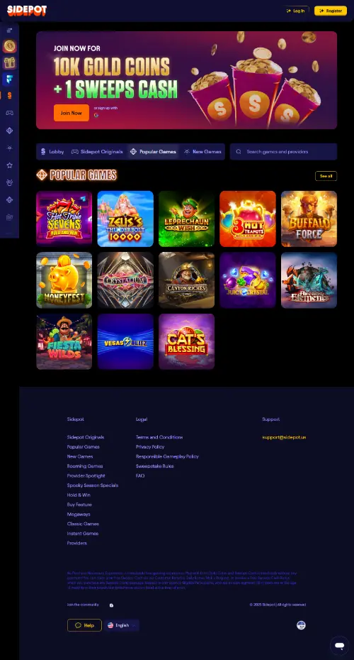 No formal VIP or tiered loyalty program. Instead, Sidepot leans on recurring promotions such as daily login rewards, Happy Hour, Lucky Spin, Showdown and Gold Rush events. If you prefer structured tiers with long-term perks, this will feel light compared to casinos that reward ongoing play.