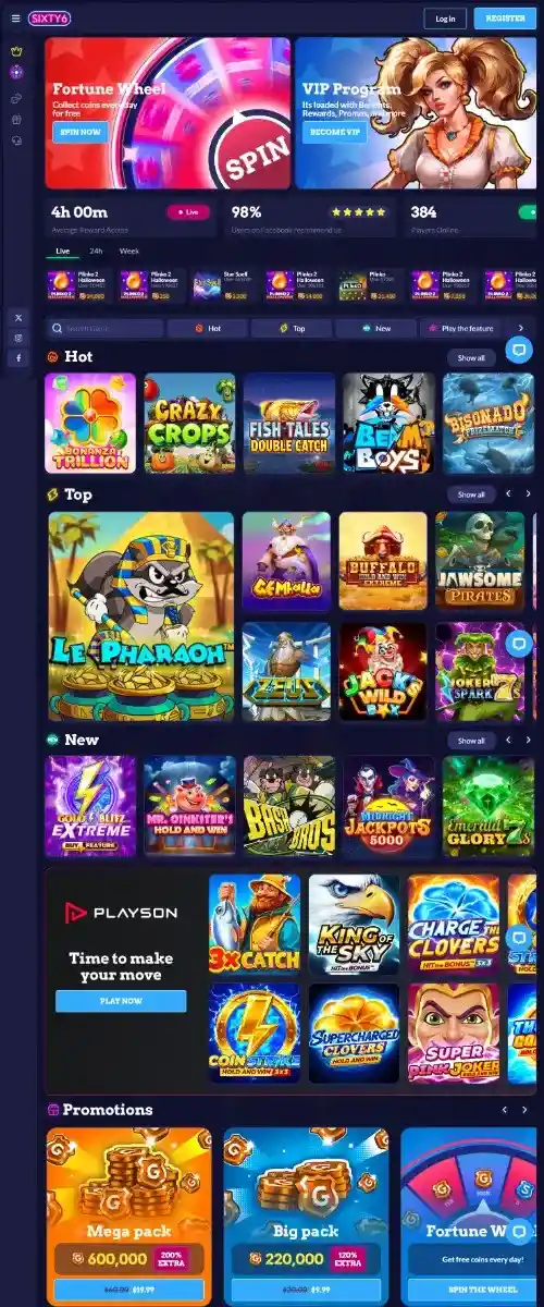 Chasing a big slot catalog and a simple daily SC trickle? Sixty6 brings roughly 930 titles, 0.2 SC each day, and a punchy first‑purchase slate that occasionally climbs to 200 percent. Gift card redemptions often land within 72 hours, and the VIP program promotes up to 20 percent weekly cashback. No table or live dealer content, a clear trade‑off.