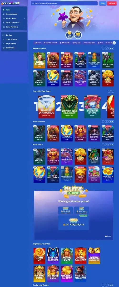 Spin Blitz delivers a hefty library of 1,500+ games, live dealer tables, and quick gift card redemptions that usually land within 24 hours. The no-purchase signup grants 2.5 SC plus 7,500 GC, and daily SC drips accumulate.