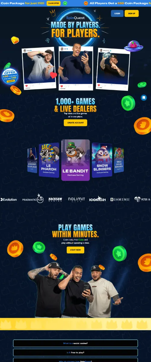 Top perk: value. SpinQuest offers a hefty opener—30 Sweeps Coins for $10 on your first purchase—paired with quick debit card redemptions and a 1,000+ game lobby featuring Evolution live dealer.