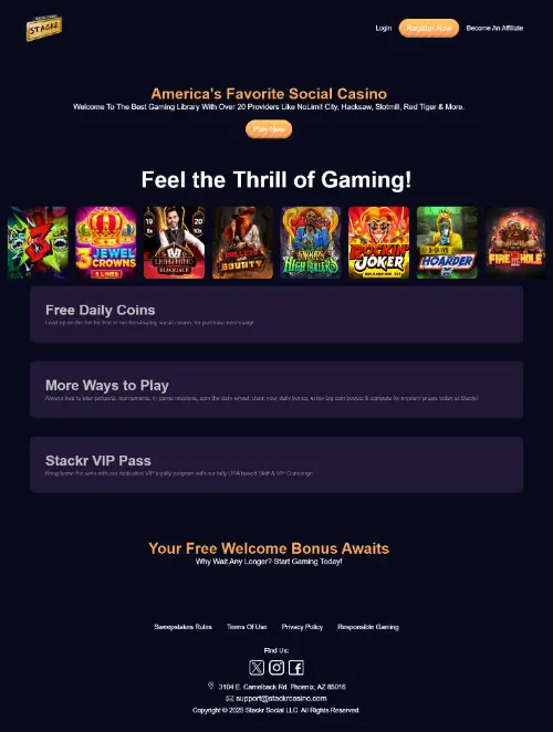 Sweeps Coins require a 1x wager before redemption. Stackr redeems at a straightforward rate of 1 SC equals 1 US dollar. We found no published list of SC-ineligible games, so assume most titles qualify unless flagged within the game or terms. A specific SC expiry window remained unclear, though the terms note that inactive accounts may have balances removed. VPN use to spoof location remains prohibited.