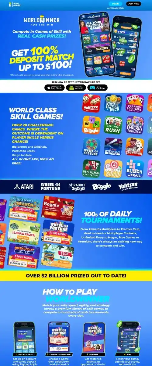 WorldWinner centers on real-cash skill tournaments featuring brand-name titles like Wheel of Fortune, Yahtzee and Angry Birds, plus a very low electronic withdrawal minimum of $1.75. Slot hunters will find the library limited since there are no slots or live casino titles.